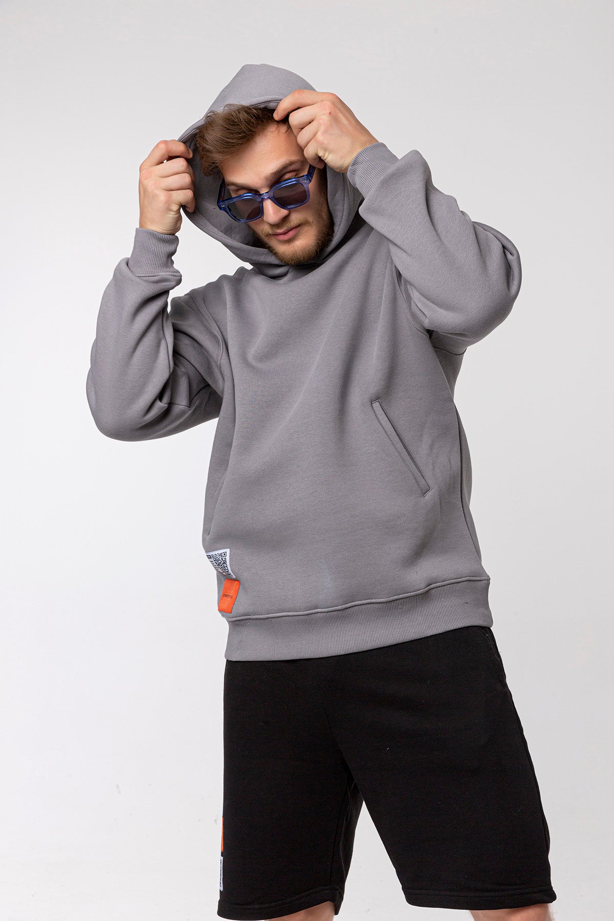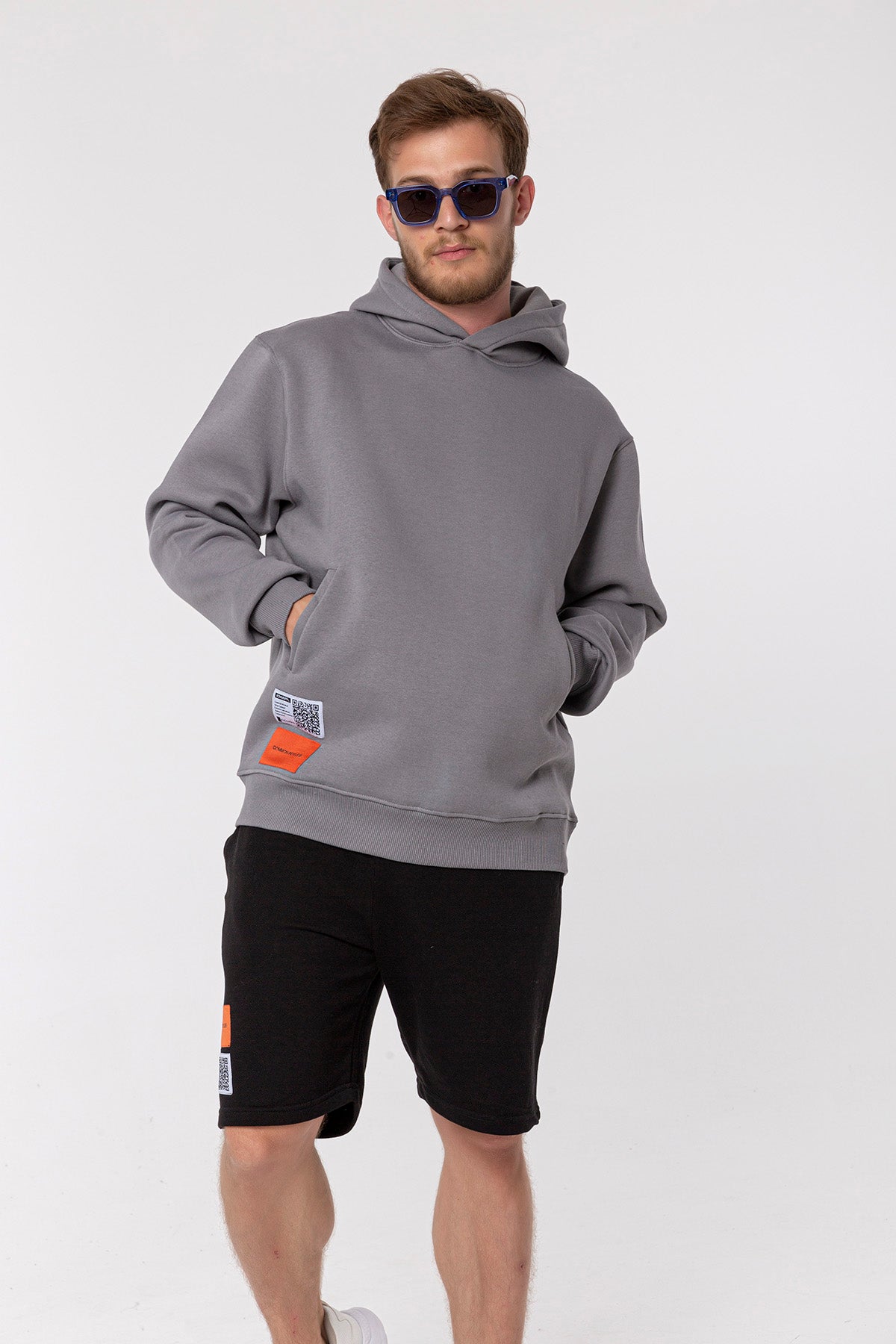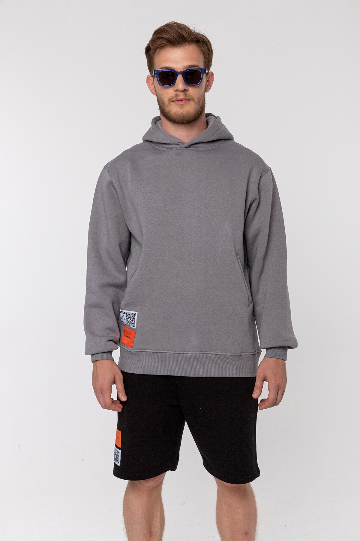 Erkek Model’in boyu 183 cm ve üzerindeki Hoodie Bedeni: M