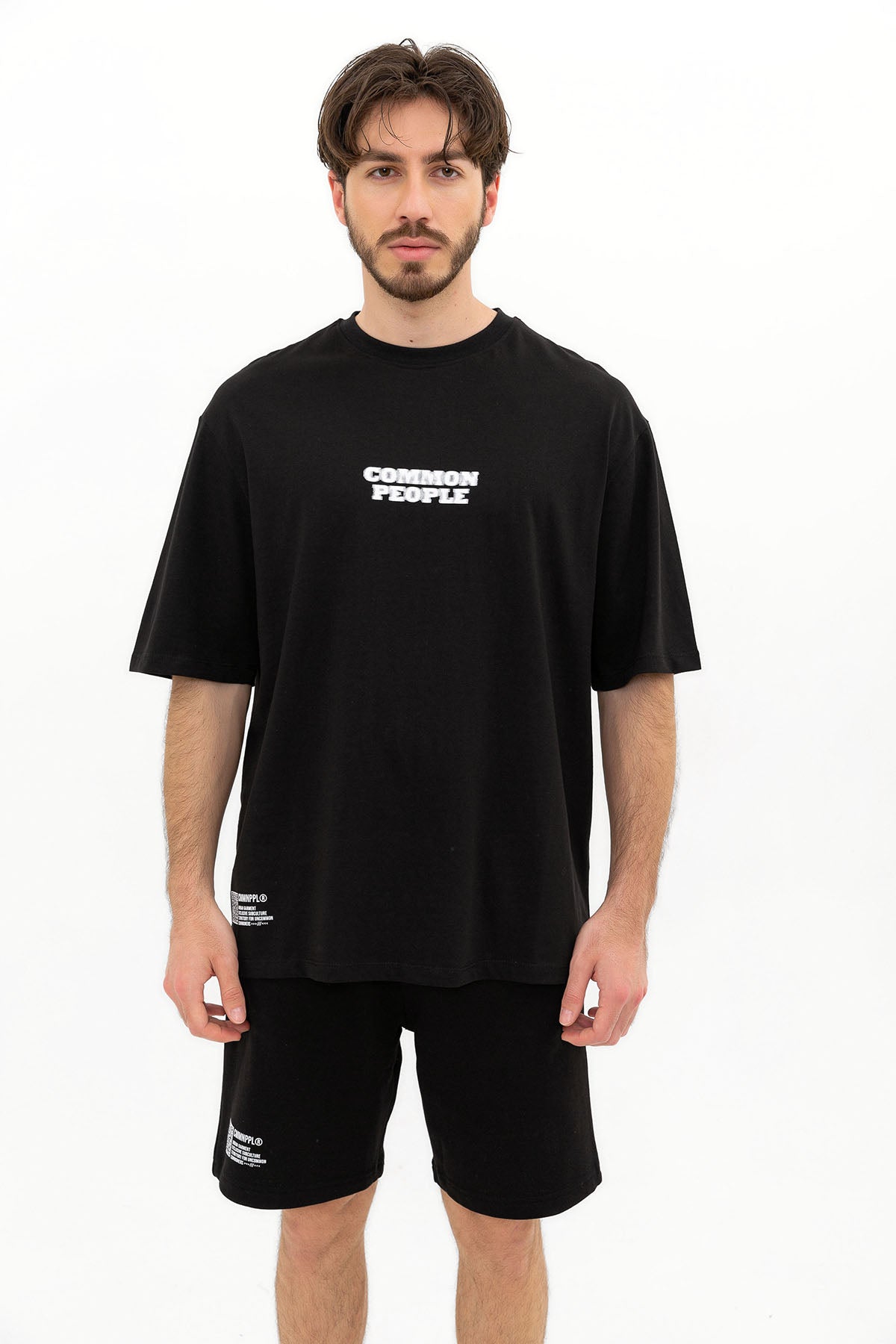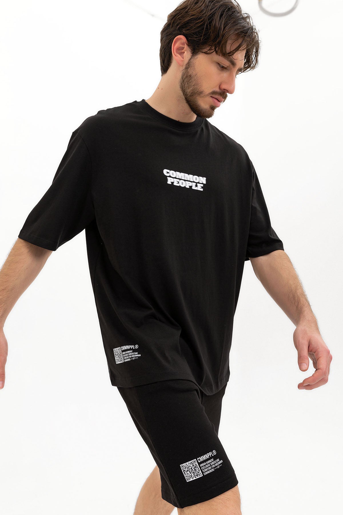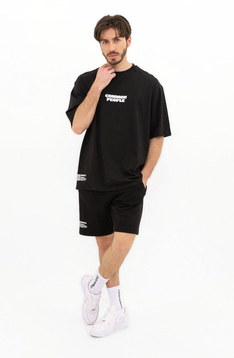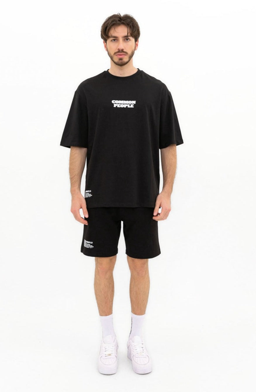 Common People İlkbahar & Yaz Koleksiyonundan Siyah Unisex Örme Şort... Her vücut yapısına uyan kalıbı, yan cepleri, lastikli ve iple ayarlanabilen bel yapısının yanısıra yandaki barkod baskı detayıyla da cool bir duruşa sahip.