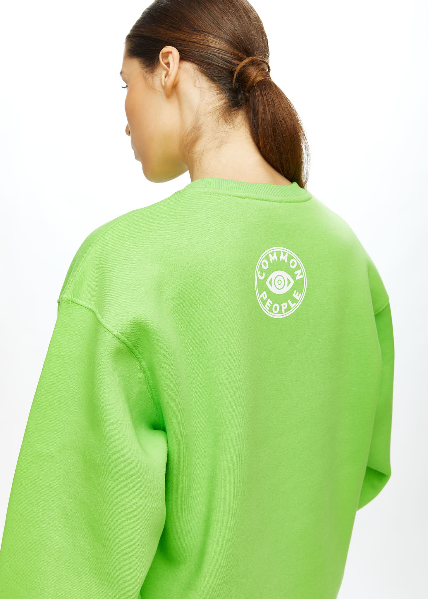 Common People Parlak Yeşil Oversize Sweatshirt, özel üretim yumuşacık kumaşıyla üstün kalite ve stili bir arada arayanlar için… Bol kesim unisex kalıbı, ön ve arka yüzünde yer alan minimal logo baskısıyla bu kış sokak modasının vazgeçilmezlerinden olacak…