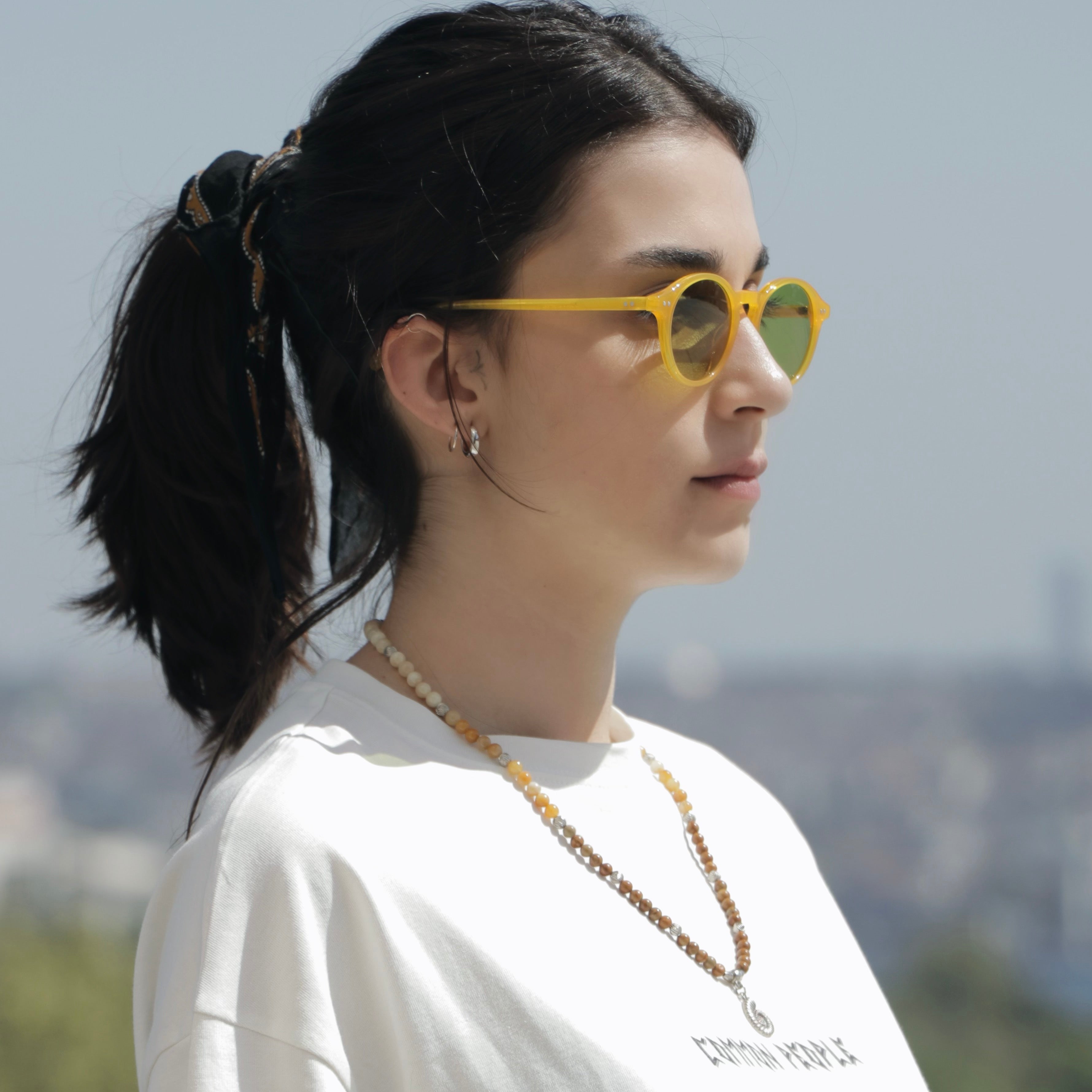 İtalya'da üretilen ve el yapımı olan Jamie güneş gözlüğümüz kemik çerçeve ve organik camlara sahip.