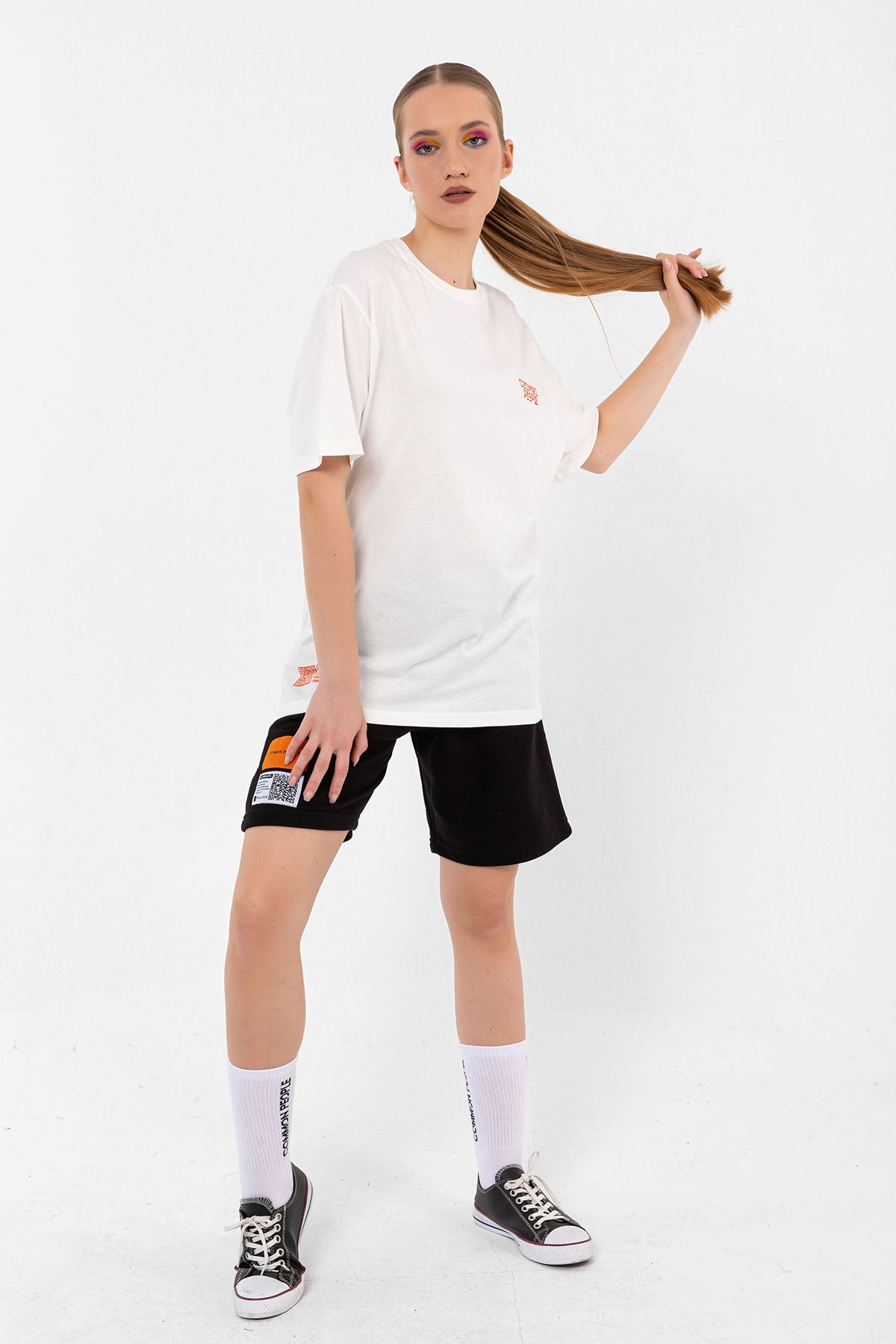 Kadın Model'in boyu 175 cm ve üzerindeki tişört Bedeni: XS